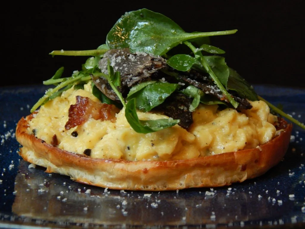 Recipe: Scramble Duck Egg, Shaved Truffles, Pancetta, Watercress, and Gruyere Toast ↓
