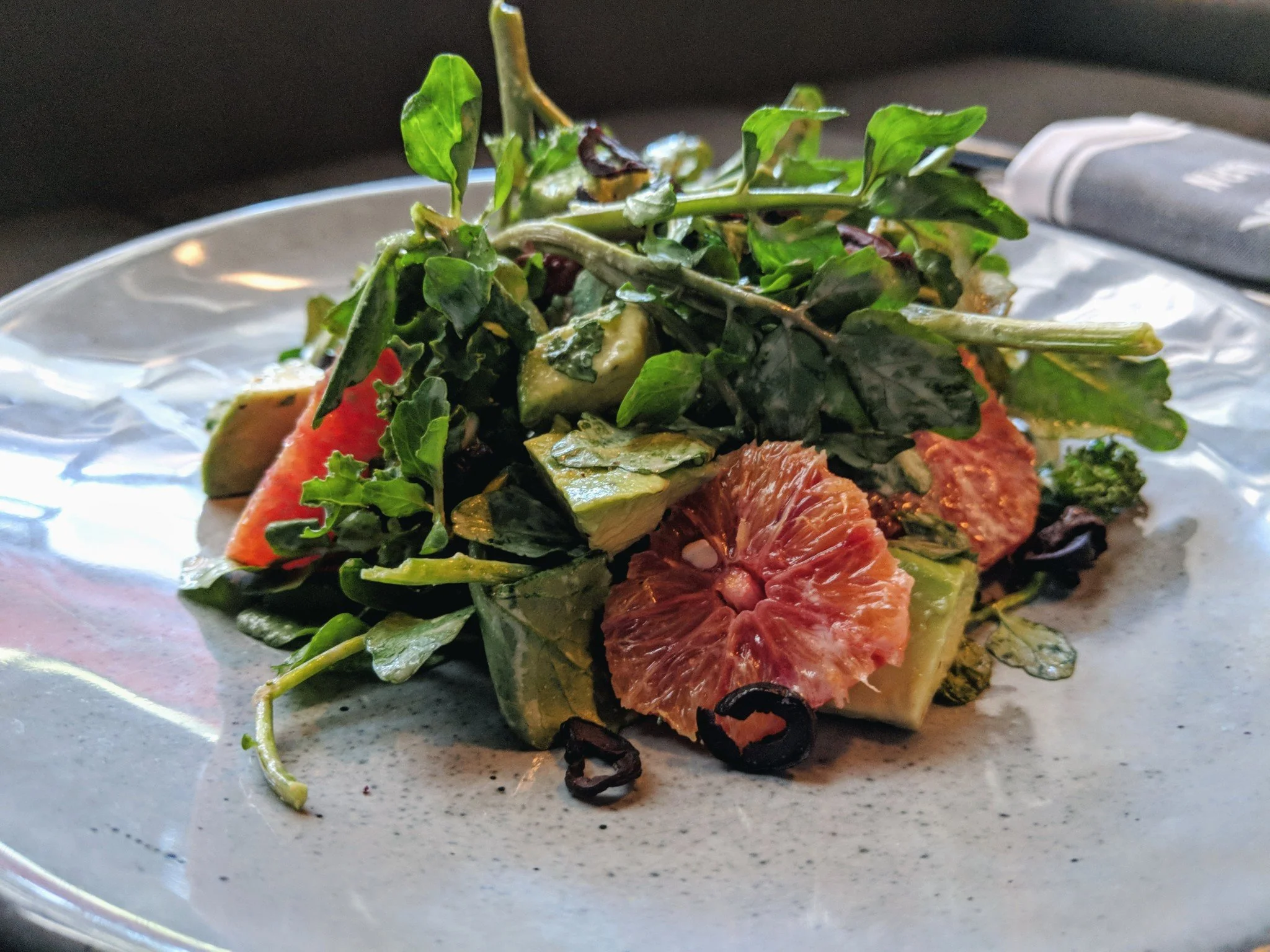 Cara Cara Orange Salad with fresh kale, avocado, black olives, and watercress, with tahini dressing.